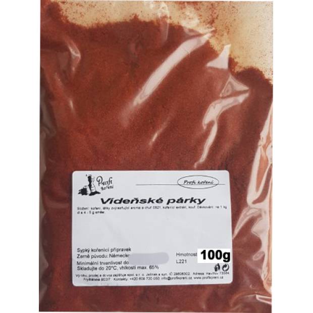 S touto kořenící směsí připravíte dokonalé Vídeňské párky. Obsahuje: koření, látky zvýrazňující aroma a chuť E621, kořenící extrakt, kouř. Dávkování: podle chuti, na 1 kg díla 4-5 g směsi.