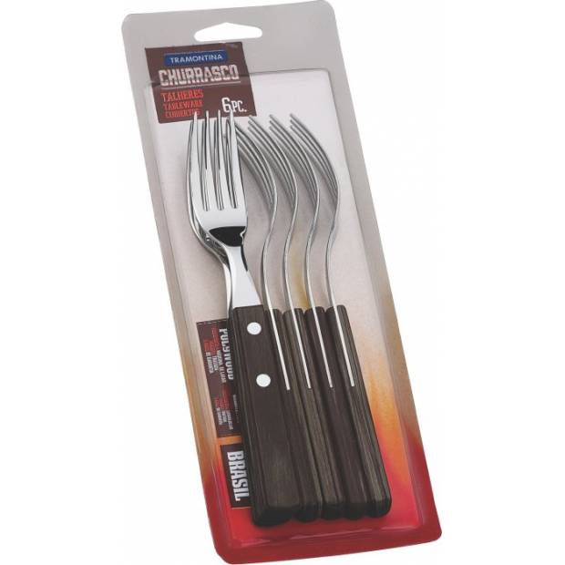Co by bylo tradiční grilování bez správného příboru? Vyvážené vidličky na steaky TRAMONTINA jsou vyrobeny nerezové oceli AISI 430, která odpovídá DIN 1.4016, a jsou ideálním doplňkem k nožům na jumbo steaky. Rukojeť je vyrobena z opravdového dřeva odolného proti nárazům a má krásnou dekorativní barvu. Za tímto účelem bylo několik vrstev borovicového dřeva impregnováno pryskyřicí a poté lisováno, nařezáno do tvaru a vyleštěno. Díky vynikající kvalitě a vysoké odolnosti je tato sada na grilování použitelná i v myčce na nádobí a zachovává si svůj atraktivní vzhled i po častém používání. Šestidílný set vidliček je nezbytný doplněk perfektního grilovacího vybavení pro každého milovníka steaků a BBQ. Lze je doplnit o nože, které zakoupíte i v našem eshopu.