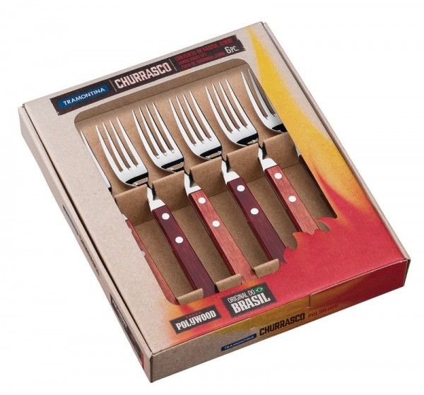 Co by bylo tradiční grilování bez správného příboru? Vyvážené vidličky na steaky TRAMONTINA jsou vyrobeny nerezové oceli AISI 430, která odpovídá DIN 1.4016, a jsou ideálním doplňkem k nožům na jumbo steaky. Rukojeť je vyrobena z opravdového dřeva odolného proti nárazům a má krásnou dekorativní barvu. Za tímto účelem bylo několik vrstev borovicového dřeva impregnováno pryskyřicí a poté lisováno, nařezáno do tvaru a vyleštěno. Díky vynikající kvalitě a vysoké odolnosti je tato sada na grilování použitelná i v myčce na nádobí a zachovává si svůj atraktivní vzhled i po častém používání. Šestidílný set vidliček je nezbytný doplněk perfektního grilovacího vybavení pro každého milovníka steaků a BBQ. Lze je doplnit o nože, které zakoupíte i v našem eshopu.