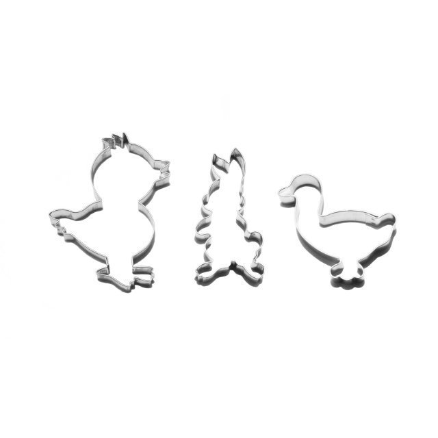 Souprava tří vykrajovátek z pocínovaného plechu s ostrou hranou, která zaručuje dokonalý tvar. Vykrajovátka se velmi snadno umývají. Kachnu, kuřátko a zajíčka v různých velikostech můžete zdobit třeba s některou z cukrářských zdobících souprav.
