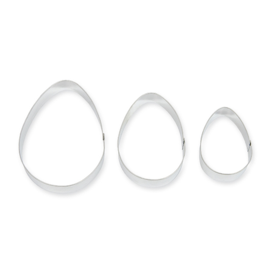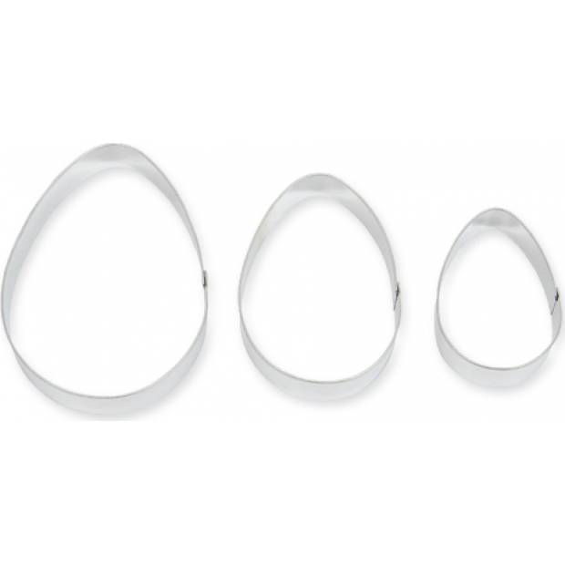 Vajíčka mají velikost 6 x 8,8 cm, 5 x 7 a 3,8 x 5,4 cm. Vykrajovátka jsou vyrobena z pocínovaného plechu, který je samozřejmě zdravotně zcela nezávadný a vzhledem k svému hladkému povrchu se po použití snadno umývá.