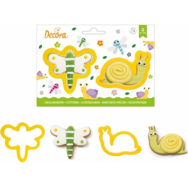 Set zahrnuje dvě plastová vykrajovátka ve tvaru vážky a šneka. Jsou vhodná pro přípravu pečených i nepečených druhů cukroví. Plně omyvatelné a zdravotně nezávadné. Ostré hrany zajistí přesné vykrojení těsta, marcipánu či fondánu nebo plastelíny.