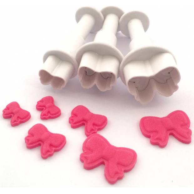 Vykrajovátka s pístem jsou velmi žádaný druh vykrajovátek pro jejich snadné použití. Jsou ideální pro zdobení malých košíčků, dortů nebo sušenek. Kousky můžete krájet nebo embossovat přímo na dort pomocí pístového vykrajovátka. Chcete-li vytvořit krásné vzory s přesným povrchem, přitlačte pevně na fondán, zatlačte na píst a uvolněte hotový výrobek. V balení 3 ks mašli o rozměrech ? 2 cm, ? 1,5 cm and ? 1 cm.