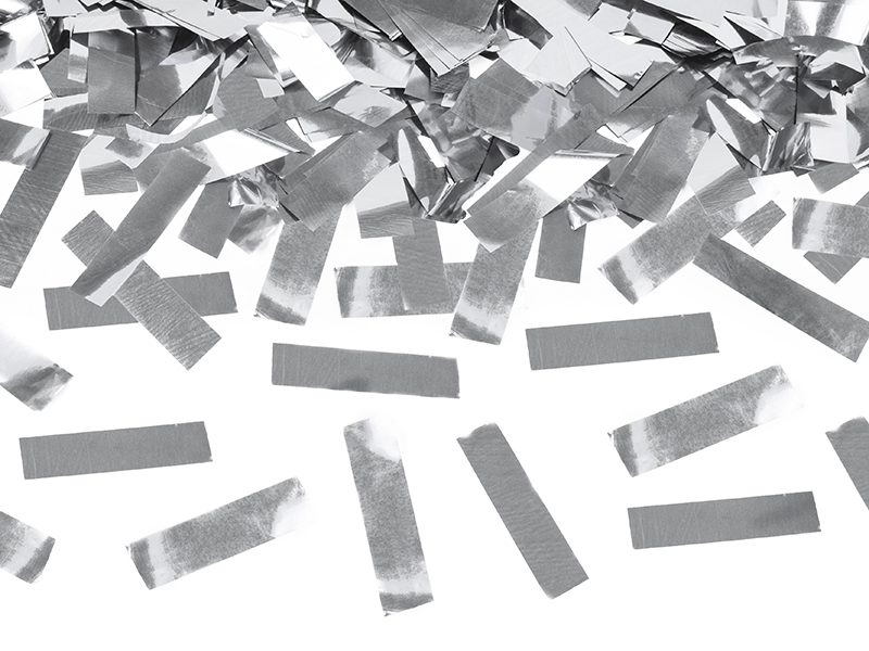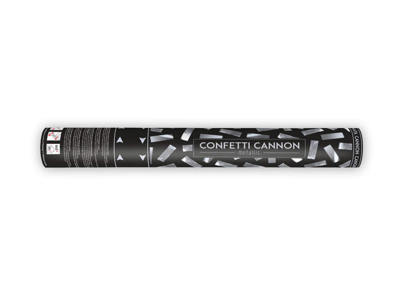 Konfetové dělo s balením papírových konfet ve stříbrném provedení.