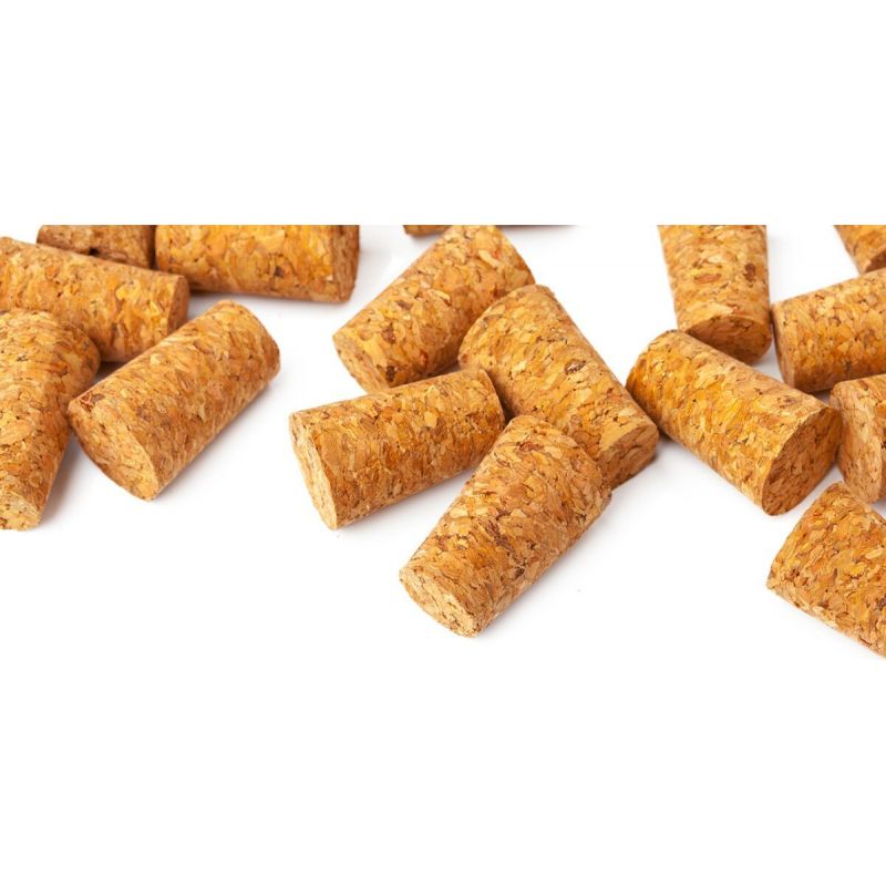 Zátka korková. 10 ks. Rozměry: pr. 2,3/2 cm, v. 2,6 cm.