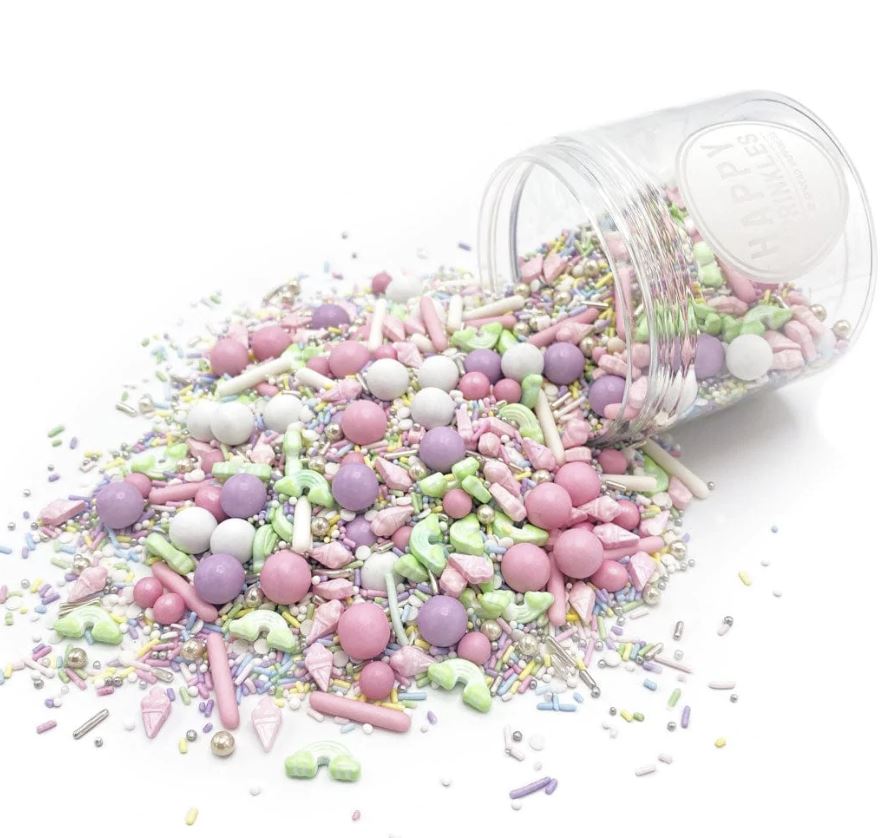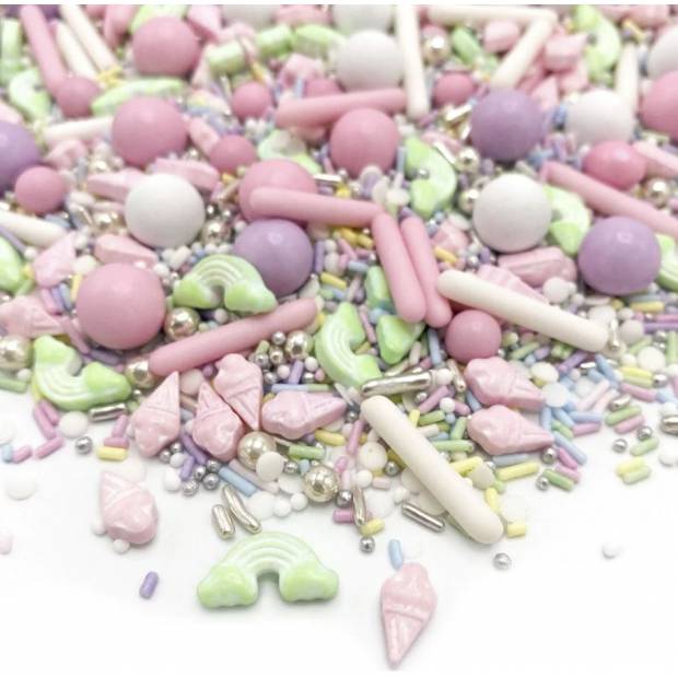 Perfektní posyp byl rychle na světě a barevná kombinace růžové, zelené, bílé a fialové se rychle stala oblíbenou. Základ pastelových tónů a stříbrných pramenů a perel dokonale ladí s malými duhami a kornouty zmrzliny, díky nimž je tato směs posypů tak zvláštní. Čokoládové perly a tyčinky dodávají perfektní nádech barvy. Naprosto ideální pro každý dort, cupcake, donut nebo cokoliv jiného, například další zmrzlinový pohár.