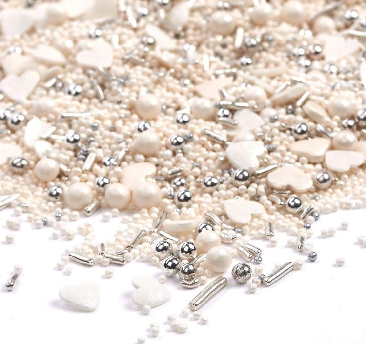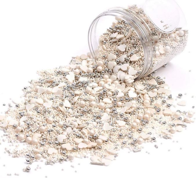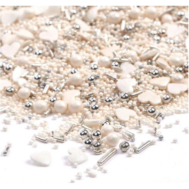 Slyšte zvonit svatební zvony - oblečené v bílém s kyticí květin, které se chystají projít uličkou…A žili šťastně až do smrti. Tato směs zdobení je ideální pro každou elegantní výzdobu svatebního dortu. Nicméně - ve skutečnosti se nemusíte vdávat, jen abyste je použili k přidání jiskry vašim pekařským výtvorům. Ať už jsou to koláče, koláče nebo sušenky - nebo možná máte jiný nápad, jak používat tyto krásné sypače? Možnosti jsou nekonečné. S bílými a stříbrnými cukrovými perlami, srdíčky a čokoládovými drtí - vaše kreativita nemá hranice.